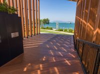 Aerial view of Hong Kong's coastal architecture. The open space features a high position with a clear sky and a stunning top-down perspective. The wood floor creates a stylish contrast against the ocean and coastline.