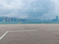 Low angle view of a jet plane on an airport runway in Hong Kong. The urban skyline and skyscrapers create a captivating backdrop. The coastal cityscape is contrasted by the calm ocean. A perfect day for landing.