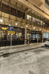 A modern building in Hong Kong's art district, with a vibrant mix of architectural styles. Cars parked outside, illuminated by streetlights and the glow of nearby restaurants and bars.