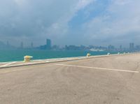 a large body of water next to a city skyline and a road with yellow poles on either side