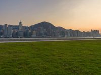a city view with grass near a river and mountains as the sun sets over the horizon