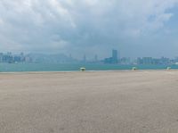 A vibrant cityscape of Hong Kong, with a coastal skyline and skyscrapers reflecting on the water. The low-lying jetty and pier add to the urban design. A perfect day by the harbor.
