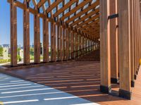 an outdoor area with a bunch of wooden beams that are attached to the ceiling and floor