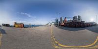 A wide harbor area in Hong Kong, with a 360-degree fish-eye view. The skyline is dominated by high-rise buildings, creating a stunning cityscape. The clear sky and calm waters of the harbor add to the serene beauty of the scene.