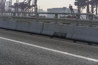 A bustling highway in Hong Kong, surrounded by industrial buildings and naval ships. Clear skies and a motion blur effect on the road create a sense of speed and movement. Overhead bridge and Armco barriers add to the urban landscape.