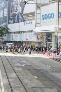 A bustling city street in Hong Kong, with high-rise buildings lining the urban thoroughfare. Pedestrians cross the busy crosswalks, and shops and storefronts add to the lively cityscape. This vibrant public space is a glimpse into the heart of Asia.