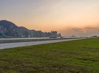 a park and a beach near the water at sunset with skyscrapers in the background
