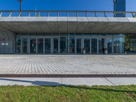 A fish-eye view of Hong Kong's urban skyline and harbor. The circular brick structure stands out against the clear sky. Straight down the road, a person on a bike adds a touch of city life to the scene.
