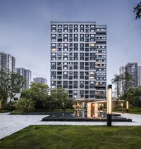 A modern apartment building in the heart of Hong's central business district. The building's profile is accentuated by the soft dawn light. Surrounded by urban architecture and artificial light, it stands as a symbol of contemporary living in China.