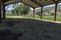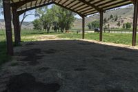This stock photo features a horse under a shelter in a rural area of Crested Butte, Colorado, USA. The outdoor area is surrounded by lush vegetation and grass, with stunning mountains in the distance. The wooden shelter provides shade for the horse and is located on a property surrounded by clear blue skies. The image showcases the natural beauty of the Crested Butte countryside, with its open spaces, gravel road surface, and woody plants. The barn and hay can be seen in the background, highlighting the agricultural aspect of the area. This photo perfectly captures the charm of rural life and real estate in Colorado.