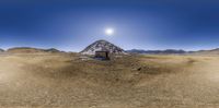 A small house in the desert of Shangri-La, China, surrounded by snow-capped mountains. The clear sky and open landscape create a serene and elevated natural environment. A perfect vacation spot in Asia.