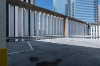 A low angle view of a modern office building in Houston, Texas. The building's concrete facade is lined with handrails, casting hard shadows on the surface. The metropolitan cityscape is reflected in the metal surfaces of the building. Urban real estate and architecture at its finest.