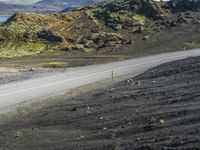 A coastal road in Iceland winds through a rugged landscape, surrounded by highland mountains and clear skies. The road surface is made of asphalt, providing a smooth thoroughfare through the elevated terrain.