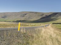 Endless road stretching across the highlands of Iceland. The clear sky and picturesque landscape make it a perfect day for a drive. The road surface contrasts with the lush green vegetation and fields along the way.