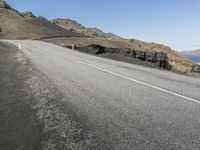 A scenic coastal road in Iceland, winding through rugged terrain with mountains in the background. Clear sky reflects on the calm ocean and tranquil lakes. Explore the stunning landscapes of Iceland's highlands.