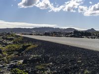 This is an image of a road surrounded by grass and vegetation in the highlands of Iceland. The landscape features mountains, trees, and rugged terrain covered in lava. The clear sky above is filled with sunlight and white contrails, creating a striking contrast. The road surface is visible, showing the texture and curves of the asphalt. This photo represents the natural beauty and ruggedness of Iceland, a European island known for its unique landscapes.