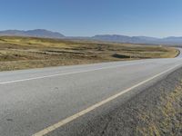 An endless road stretches through the captivating landscape of Iceland. Mountains rise in the background as a bicycle rests next to the curve. Clear skies and a yellow line on the asphalt add depth to this picturesque European island scene.
