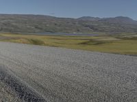 A scenic road in Iceland, surrounded by lush green grass and fields. The clear sky and wide horizon enhance the beauty of the natural environment. Journey through Iceland's captivating landscapes.