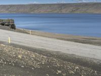 A road along the coastal highlands of Iceland, surrounded by rugged mountains and clear skies. The highland landscape is dotted with lakes and rivers, covering the elevated terrain with nature's beauty.