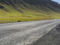 This is an image of a road in Iceland surrounded by mountains and grassy highlands. The landscape showcases the natural beauty of this European island, with clear skies and sunlight illuminating the terrain. The road surface is made of asphalt and tar, and it cuts through the land lot with vegetation on both sides. The mountains in the distance create a stunning horizon, and the slopes add to the dramatic scenery. This photo captures the untouched beauty and unique nature of Iceland's highlands.