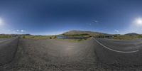 a fisheye view of a road leading to a lake and mountains with the sun on its side