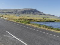 A scenic road in Iceland travels alongside a majestic mountain range, with water, grass, and bushes in view. The clear sky above adds to the beauty of the European highland landscape.