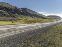 This breathtaking image captures the beauty of rural Iceland. The landscape features a winding road that cuts through mountains and highlands, with vegetation and grass growing along the road surface. The clear sky above showcases the natural wonders of the island. In the distance, you can see slopes and plains, adding depth and dimension to the scene. This photo represents a serene day in the European countryside, with nature and stunning scenery all around.