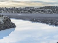 a person walking along a rocky hill beside some blue water and a rock formation with a reflection in it