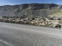 A scenic view of a rugged road in Iceland, surrounded by breathtaking mountain landscapes and clear skies. The road surface made of dark asphalt blends with the rocky highland terrain.