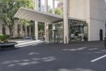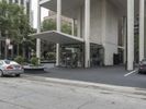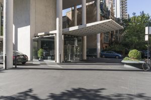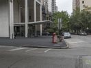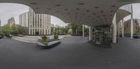A fish-eye view of a modern office building in Chicago, Illinois. The bustling city street is lined with trees, adding a touch of nature to the urban landscape. A vibrant metropolitan area with impressive architecture and a mix of residential and commercial properties.