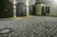 A classic architecture residential building illuminated by artificial light at night. Cobblestone road leads to an open space with an impressive arch. Dark surroundings add to the charm of this suburban scene.