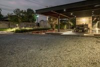 the outside of a home with a patio lit up at night, including a bench, gravel and fire pit