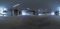 a fish eye view of a large indoor parking lot with a big ceiling over the space