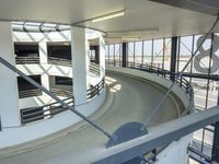 This stock photo showcases an indoor racing track located in the vibrant city of Berlin, Germany. The track winds through a modern building surrounded by other architectural structures. The image captures a sunny day, allowing natural light to flood through the large windows. The track is made of smooth concrete and is bordered by a glass guard rail, ensuring the safety of the vehicles. This unique tourist attraction blends modern architecture with an exciting racing experience. Explore the real estate possibilities of this building, with its contemporary design and attractive interior features. The iron and steel balusters, along with the spiral staircase, add a touch of elegance to the overall design. The parking deck, located nearby, provides convenient access and ample parking space for visitors. Berlin, a bustling city in Europe, offers a captivating mix of history, culture, and stunning architectural marvels like this. Experience the thrill of racing in this one-of-a-kind location in Deutschland.