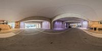 Indoor skatepark in Houston, Texas. Purple interior design accents the concrete surfaces and flooring. Column-lined arches create an architectural profile. Ramp extends from the front to the back, perfect for skateboarders.