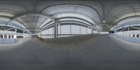 A modern architectural marvel in Toronto, Ontario. This indoor structure features multiple roof tops, providing a perfect setting for skateboarders to perform tricks. The sleek concrete design and ample space make it an ideal venue for events and gatherings.