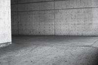 A man riding his skateboard in an old concrete parking garage in Los Angeles, California. Monochrome backdrop highlights the urban architecture and structural elements. High-rise walls create an open space for skateboarding.