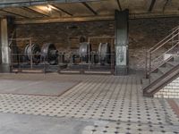 This stock photo depicts an industrial brick warehouse located in Berlin, Germany. The spacious hall is filled with several machines and pipes, and it features iron staircases leading to different levels. The tile floor adds a rugged touch to the overall urban setting. The classic architecture and industrial design create a symmetrical and visually appealing space. The combination of brickwork, metal beams, and concrete surfaces enhances the warehouse's industrial charm. This image captures the essence of open space, highlighting the city's rich architectural heritage in Europe.