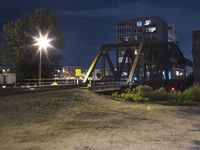 Industrial Chicago at night. A train crosses a bridge over water, passing a factory. The city's rugged architecture is illuminated by artificial light. A dark, urban scene with hints of the city's history.