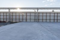 A dawn view of an industrial factory in Toronto, Ontario. The sunlight shines on the concrete building, emphasizing its architectural profile. The clear sky and sunny weather create a vibrant backdrop.