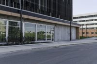 This image shows an empty city street in Toronto, Canada. The tall windows of the business building reflect the clear sky above. A tree on the sidewalk adds a touch of green to the urban landscape. The road surface, made of tar and asphalt, leads to industrial buildings and warehouses in the distance. The scene captures the urban design and the composite materials used in the construction of the buildings. This photo represents a typical day in Toronto's industrial district.