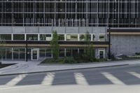 A quiet street in the heart of Toronto, Canada. The shadows of a bike rider pass by a modern residential building. Urban design and elevated condos contrast with the surrounding grass and trees.