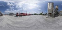 Industrial manufacturing area with trucks parked on a gravel surface. Clouds fill the open space above, creating a dramatic backdrop for the scene. A straight road of concrete leads one quarter into the image.