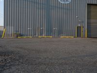 At the break of dawn in Salt Lake City, Utah, an industrial warehouse stands tall against the clear sky. The dirt and gravel surfaces contrast with the surrounding vegetation, making it a perfect storage and manufacturing space.