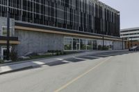 Industrial property in Toronto, Canada. The three-story building with a composite material facade stands near an urban road. A ramp leads to the street, showcasing the building's accessibility.