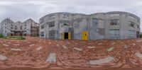 a very big building with some nice bricks and a yellow door on the front side