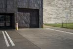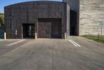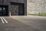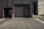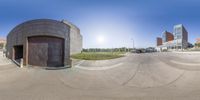 A fisheye view of Iowa City, USA. The image captures the city's architecture and infrastructure, with straight roads and lined buildings. The concrete streets and industrial loading docks add to the urban landscape.
