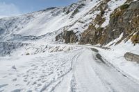 A breathtaking view of a snow-covered mountain road in Italy. The road surface curves and follows the natural terrain, with a rock wall on one side. Clouds loom overhead, creating a dramatic backdrop. A perfect POV for adventure enthusiasts.