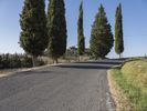 A scenic road in Tuscany, Italy, surrounded by lush greenery and towering trees. The sunlight casts beautiful shadows on the pavement, creating a picturesque landscape. A perfect vacation spot for nature lovers.