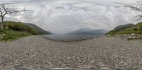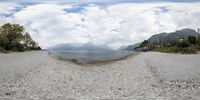 a view of a mountain and a beach and mountains through a glass looking panorama lens